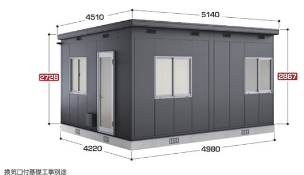 | 標準装備品 | 框ドア、ガラス窓、雨とい、フード付20cm換気扇取付用パネル、フード付給気パネル、エアコン取付支柱、壁・床用断熱材 |
