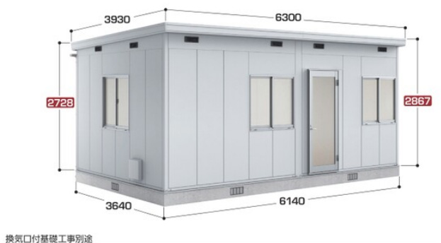 | 標準装備品 | 框ドア、ガラス窓、雨とい、フード付20cm換気扇取付用パネル、フード付給気パネル、エアコン取付支柱、壁・床用断熱材 |